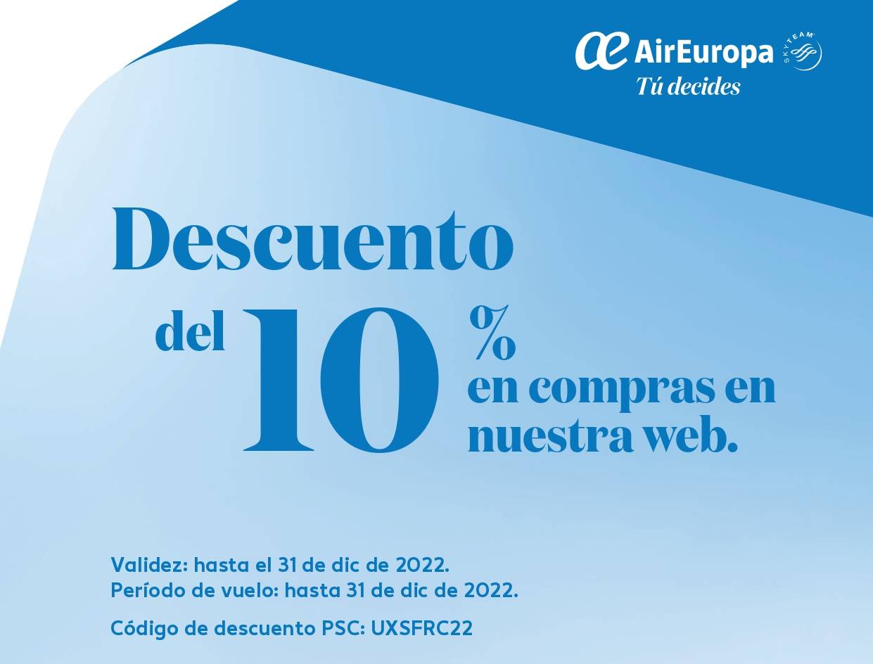 Aprovecha este descuento exclusivo para clientes Sinerqki, no pierdas la oportunidad, utiliza el codigo UXSFRC22 para obtener 10% de descuento en tus compras a través de la web de Air Europa.